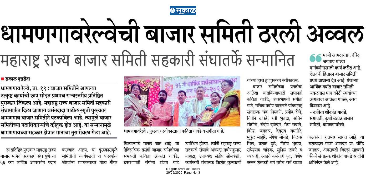 धामणगाव कृषि उत्पन्न बाजार समितीला वसंतदादा पाटील स्मृती आदर्श पुरस्कार